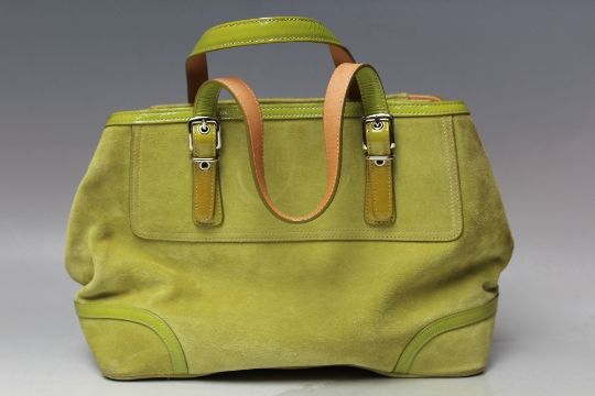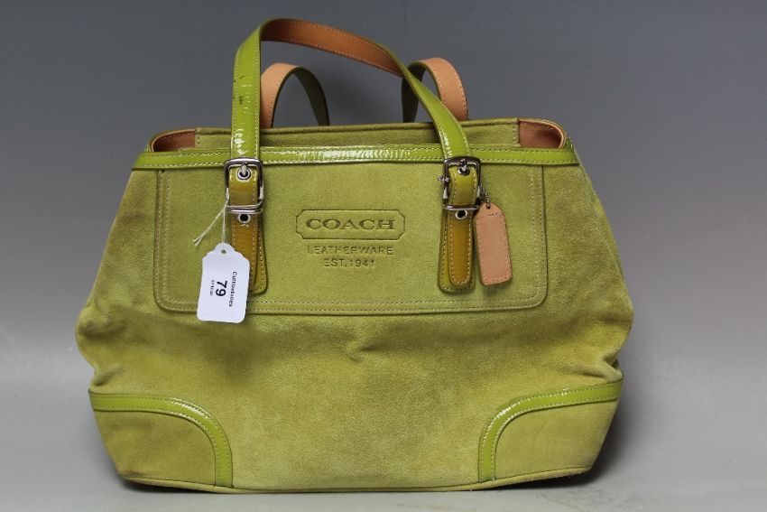 A COACH SUEDE LEATHER HANDBAG, lime green, with twin flat handles and trim, zip and stud fastening, dust bag, H 23 cm, W 37 cm S/D
