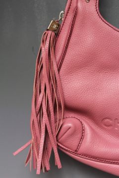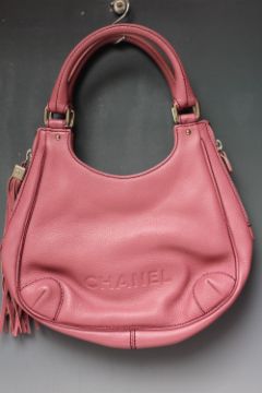 A CHANEL PINK LEATHER HANDBAG, double loop handles, with zip detail and tasselled to the sides, stud fastening, H 28 cm, W 34 cm
