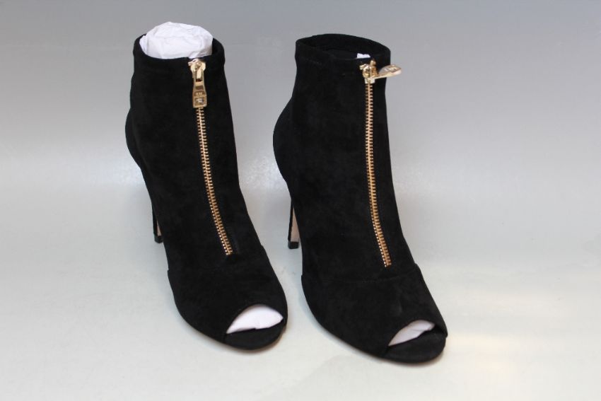 A PAIR OF KAREN MILLEN BLACK SUEDE OPEN TOE ANKLE BOOTS, zip detail, size EU 39