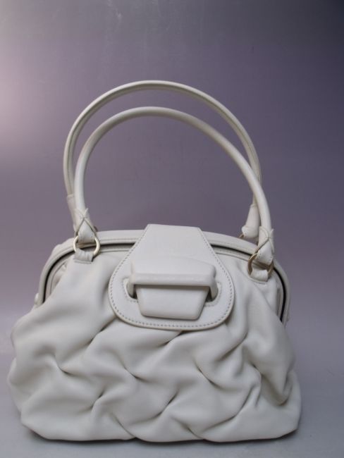 A SMALL SMYTHSON OF BOND STREET CREAM LEATHER HAND BAG, with gold tone hardware, twin handle with hinged closure and unusual leather fastening, purple satin lining interior, single zippered and two open interior pockets, complete with dustbag, width 33 cm, height including handles 40 cm, depth 11 cm