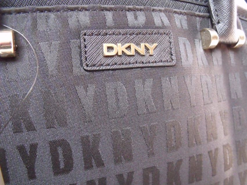 A DKNY BLACK FABRIC REPEAT LOGO DESIGN HANDBAG, gold-tone hardware, detachable shoulder strap, W 27 cm, H 27 cm, D 15 cm