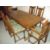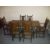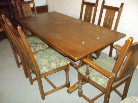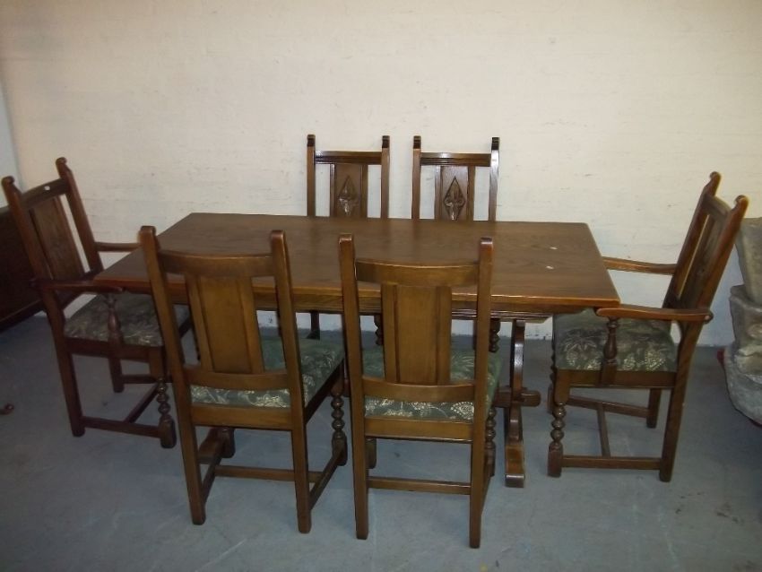 AN OLD CHARM OAK DINING SET A TABLE AND SIX CHAIRS INCLUDING TWO CARVERS.