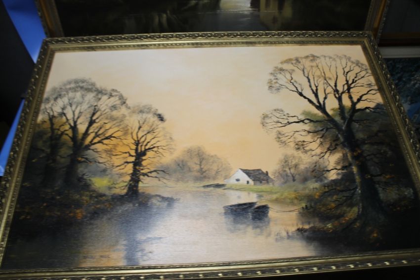TWO OIL ON CANVAS OF LAKESIDE SCENES, ONE SIGNED DIGBY PAGE, THE OTHER DAVID A. JAMES TOGETHER WITH AN OIL ON CANVAS STREET VIEW SIGNED LOWER RIGHT JAMES HORNE, APPROX 44 X 39 CM (3)