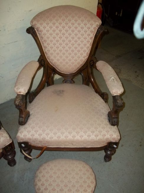 TWO EDWARDIAN CHAIRS AND FOOT STOOLS.