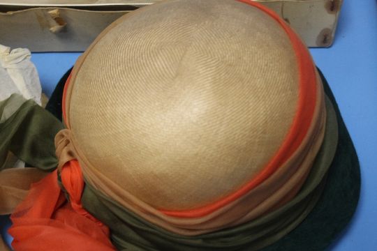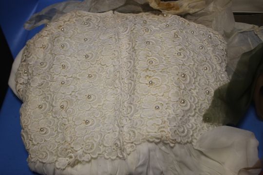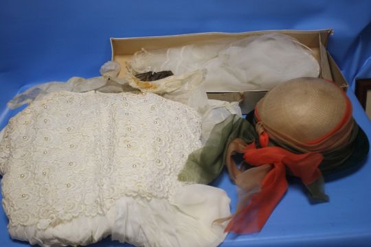 A VINTAGE WEDDING DRESS TOGETHER WITH A VEIL AND A HAT