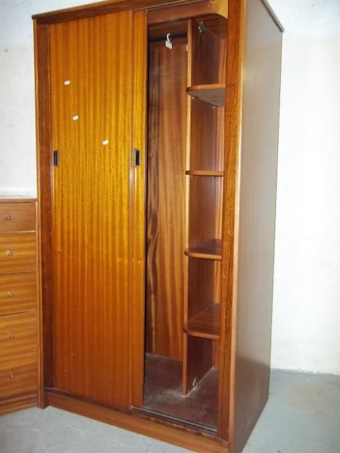A TWO PIECE BEDROOM SUITE WITH SLIDING DOORS CONSISTING OF A WARDROBE AND A FIVE DRAWER CHEST MADE BY AUSTINSUITE