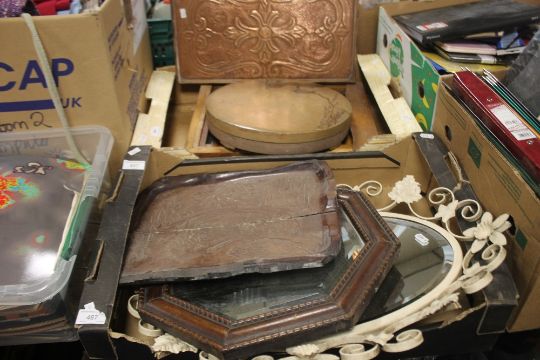 A LATE 19TH CENTURY FOLDING/WALL HANGING CAMPAIGN MIRROR, A/F together with an Oriental style circular lidded box, an Arts & Crafts type beaten copper plaque in wood frame with a central cross design, together with a quantity of beaten pewter ware, two mirrors and a wooden plaque