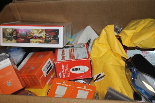 FOUR BOXES OF MAINLY NEW ITEMS TO INCLUDE SWIMMING GOGGLES DRINKS BOTTLES, CHILDREN'S TOYS ETC.