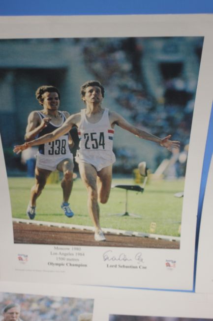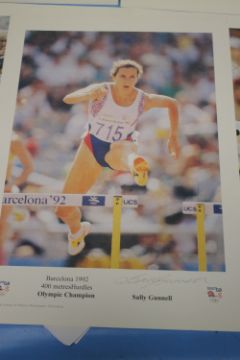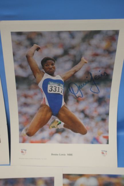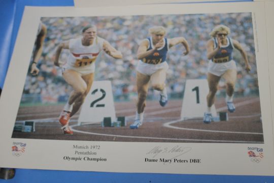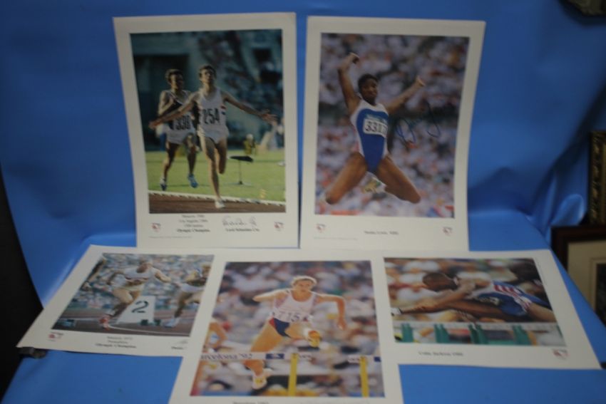 FIVE SIGNED PRINTS OF BRITISH OLYMPIC CHAMPIONS to include Dame Mary Peters, Lord Sebastian Coe, Sally Gunnell, Colin Jackson OBE and Denise Lewis MBE (5)