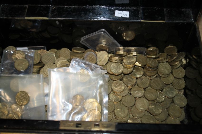 AN ANTIQUE CASH BOX OF 3d COINS