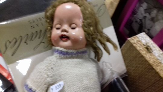 A TRAY OF BED LINEN AND A DOLL ETC.