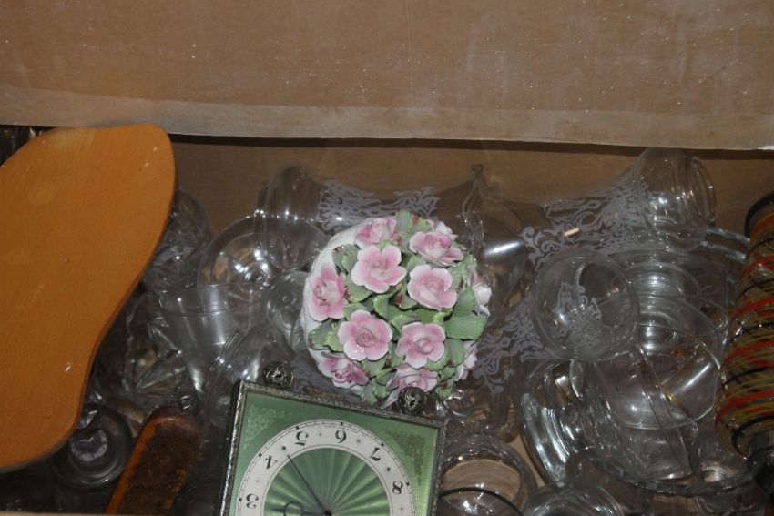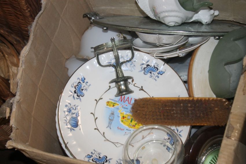 FOUR TRAYS OF CERAMICS AND GLASSWARE (TRAYS NOT INCLUDED)
