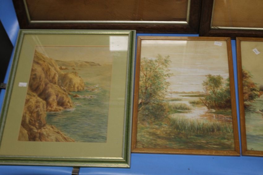 TWO ANTIQUE GLAZED OAK FRAMES TOGETHER WITH THREE SMALL WATERCOLOUR SEASCAPES