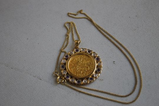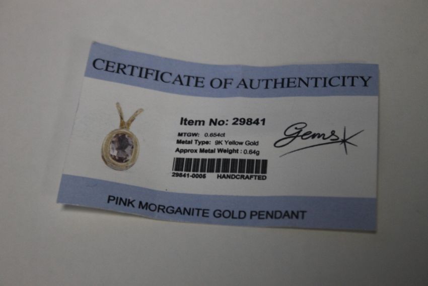 A 9 CT GOLD PINK MORGANITE PENDANT WITH COA, METAL WEIGHT 0.64 g TOGETHER WITH A GOLD PLATED 1953 SIXPENCE NECKLACE AND AN 18 CT GOLD "CHROME DIOPSIDE & DIAMOND" PENDANT WITH COA (3)