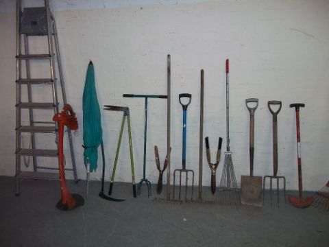 A SELECTION OF GARDEN TOOLS TO INCLUDE AN ALUMINIUM STEP LADDER AND A STRIMMER ETC.