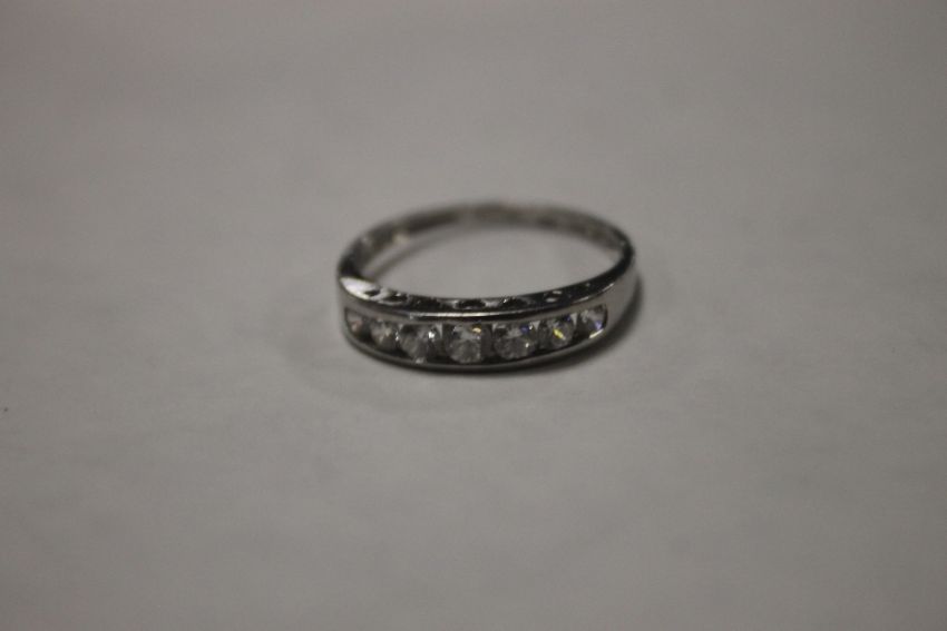 A LADIES PLATINUM SEVEN STONE (CZS) RING