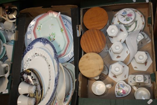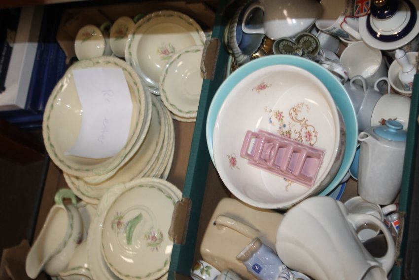 A TRAY OF CERAMICS TO INCLUDE POOLE POTTERY, DUCAL, CARLTONWARE ETC., A TWENTY THREE PIECE NEWHALL DINNER SERVICE - A FEW PIECES DAMAGED, TWO LARGE JOHNSON BROTHERS TURKEY PLATES - "THE FRIENDLY VILLAGE" AND "MERRY CHRISTMAS", A QUANTITY OF BOXED AND UNBOXED COLLECTOR'S PLATES, MAINLY DOULTON, AND TWO TRAYS OF CERAMICS TO INCLUDE PORTMEIRION LARGE LIDDED POT, CHRISTMAS PLATES, CANDLE HOLDERS ETC. (TRAYS NOT INCLUDED)