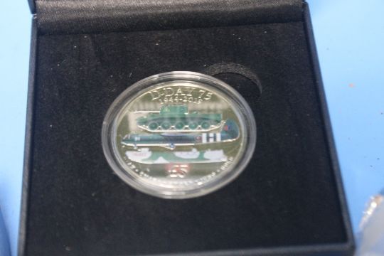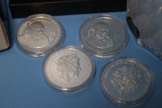 A CASED COMMEMORATIVE GUERNSEY D-DAY £5 COIN TOGETHER WITH THREE CHURCHILL HALF CROWNS A 2000 PAPERWEIGHT AND AN AYNSLEY BROOCH