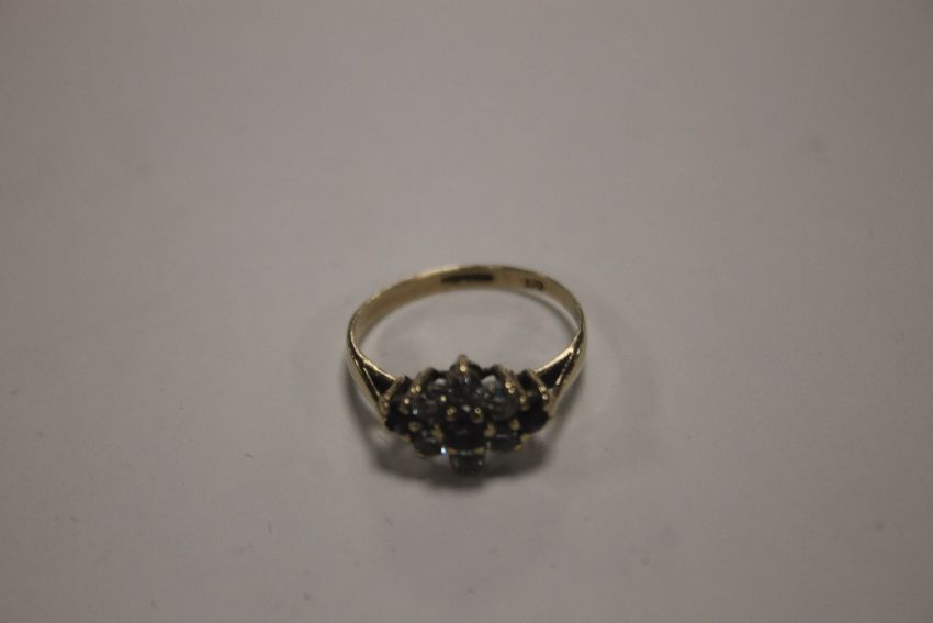 A LADIES 9 CT GOLD DRESS RING SET WITH CZS AND PURPLE STONES