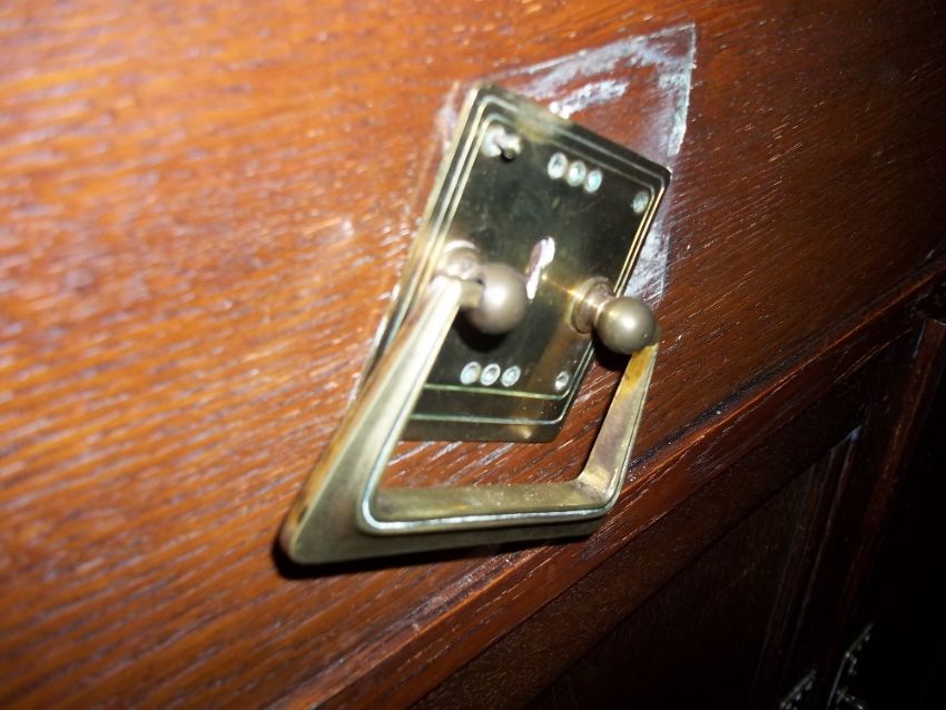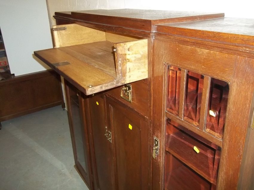 AN OAK ARTS AND CRAFTS STYLE SIDE BY SIDE TALL BOY SIDEBOARD WITH SOLID BRASS HANDLES, W 164 CM, D 42 CM, H 154 CM Condition Report: There is a split in the top, surface only, a loose handle, no other obvious damage just mould which will clean off