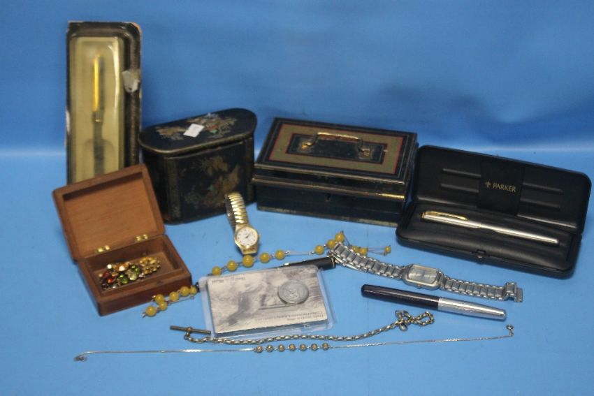 A QUANTITY OF COLLECTABLES TO INCLUDE PENS, COSTUME JEWELLERY, WRIST WATCHES ETC.