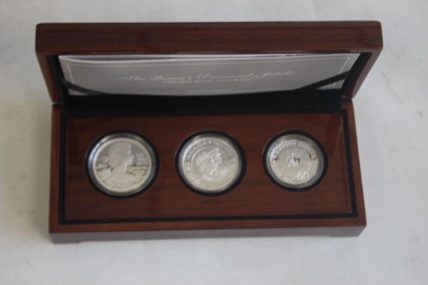 QEII DIAMOND JUBILEE 2012 THREE SILVER COIN SET, consisting of UK £5, Canada $20 and Australia $50, in case of issue with COA.
