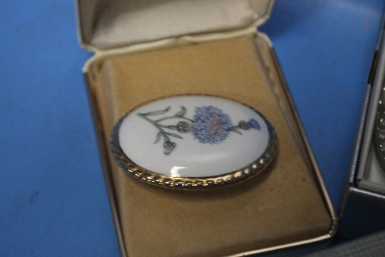 TWO HALCYON DAYS ENAMELS, AN AYNSLEY BROOCH, AN ITOH & CO TIEPIN, AND TWO PARKER FOUNTAIN PENS - ONE PROMOTIONAL WITH 'WYKO' LOGO