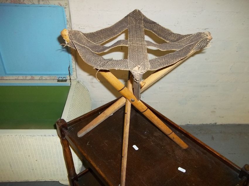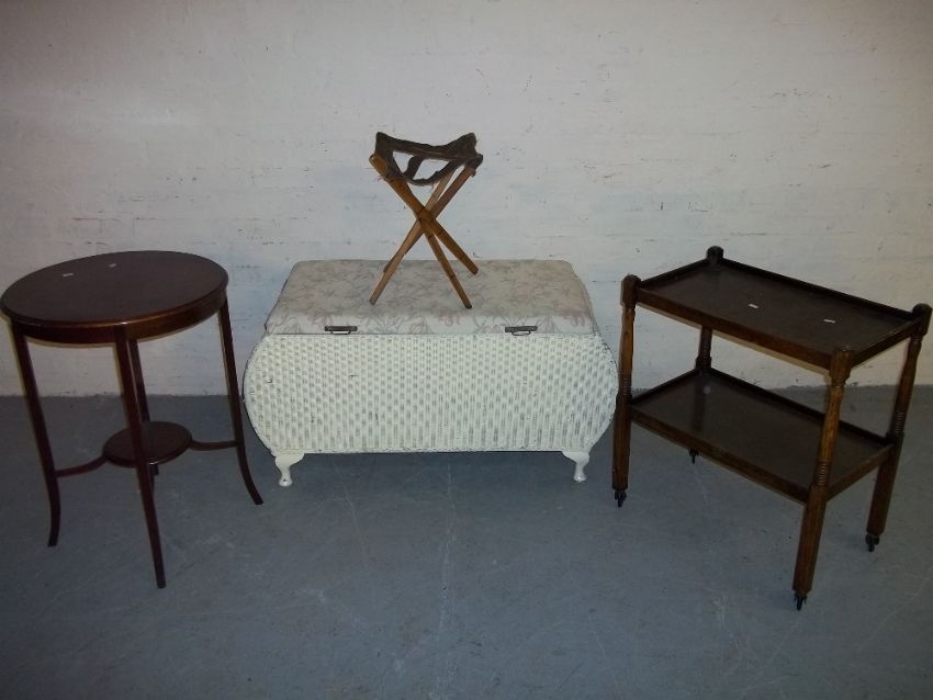 A SELECTION OF FOUR ITEMS TO INCLUDE A LOOM TYPE BLANKET BOX AND A TEA SERVING TROLLEY ETC.