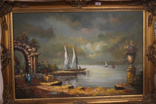 A FRAMED AND GLAZED OIL ON CANVAS DEPICTING A LAKESIDE SCENE SIGNED T. VAN MEEREN