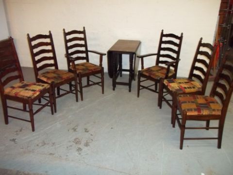 AN OAK DROPLEAF DINING SET COMPRISING A TABLE AND SIX CHAIRS INCLUDING TWO CARVERS