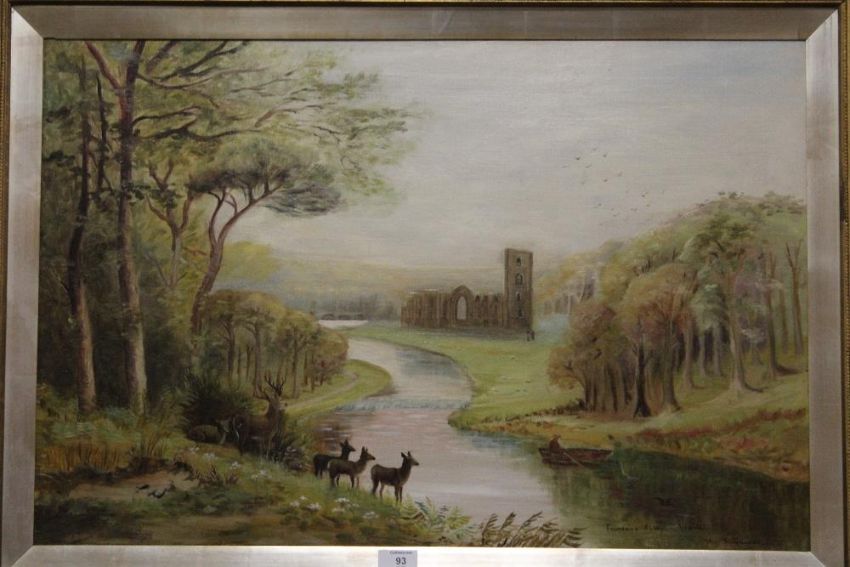 A LARGE GILT FRAMED OIL ON CANVAS ENTITLED 'FOUNTAINS ABBEY - YORKSHIRE' BY E M JAMESON
