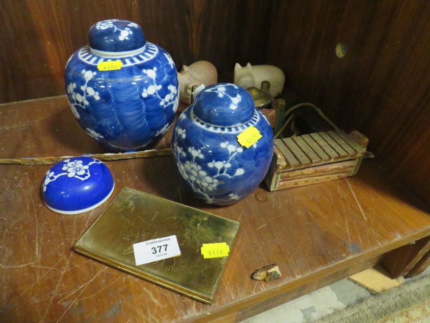 TWO CHINESE BLUE AND WHITE PRUNUS PATTERN GINGER JARS, AFRICAN BEADWORK STRAP, SOAPSTONE HIPPOS ETC.