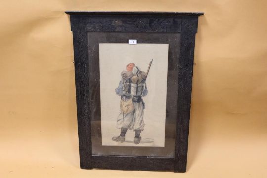 J.C. HILL. Study of an infantryman with backpack and rifle etc, signed and dated 1914 lower left, framed and glazed, 53 x 32 cm
