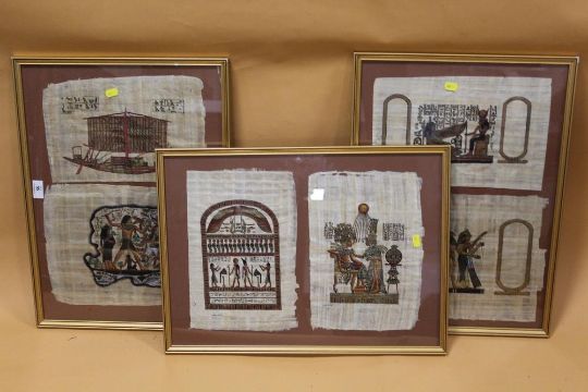 THREE FRAMED AND GLAZED EGYPTIAN PAPYRUS PICTURES