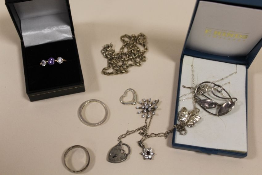 A BAG OF ASSORTED SILVER JEWELLERY TOGETHER WITH A YELLOW METAL DRESS RING