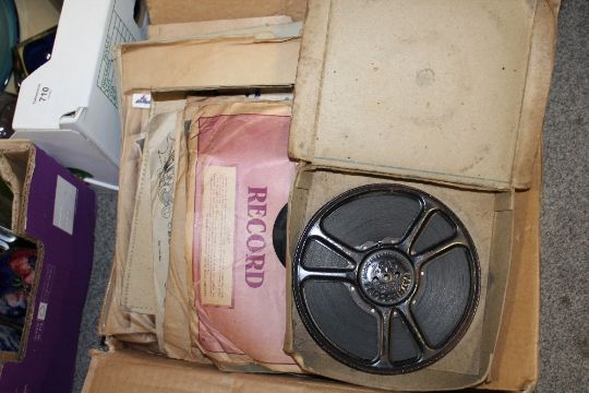 A BOX OF VINTAGE RECORDS, TOGETHER WITH A VINTAGE FILM REEL