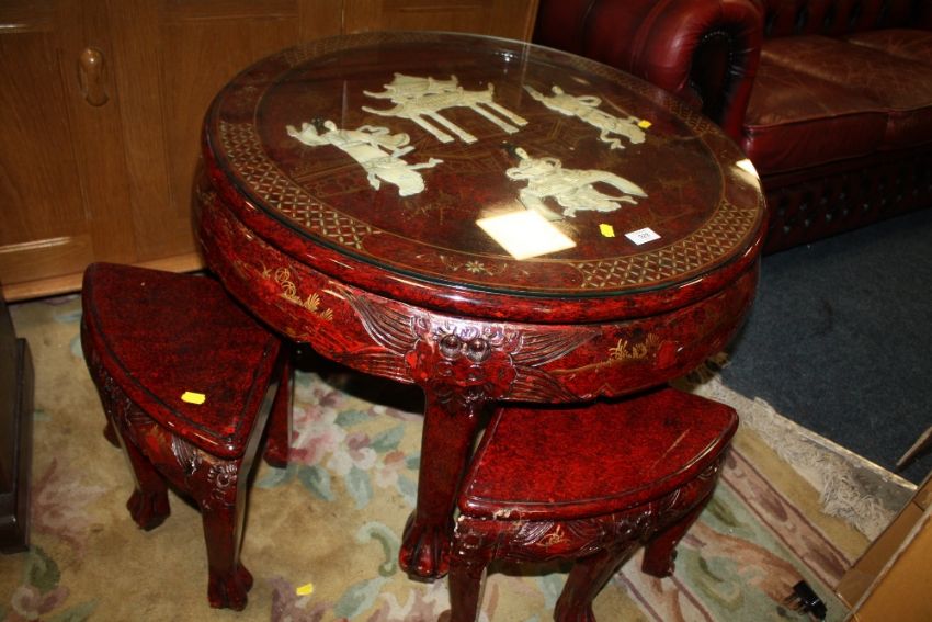 AN ORIENTAL RED LACQUERED NEST OF FIVE TABLES, DIA. 78 CM