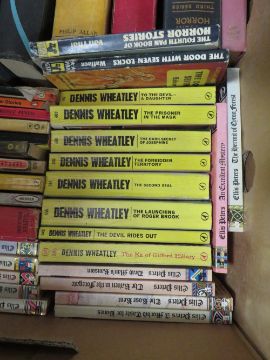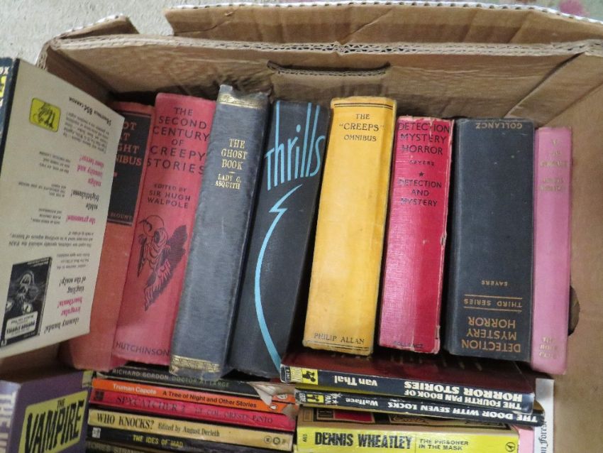 THREE BOXES OF VINTAGE BOOKS COMPRISING A BOX OF VARIOUS OLD BOOKS TO INCLUDE THRILLERS, STORIES AND HORRORS, TWO BOXES OF OLD REFERENCE BOOKS TO INCLUDE CHINA, PEWTER, ANTIQUES, SILVER PLATE AND GOLD IDENTIFICATION MARKS
