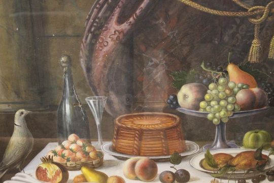 A GILT FRAMED AND GLAZED LARGE WATERCOLOUR OF A TABLE TOP SCENE WITH RING COLLARED DOVE, OVERALL SIZE H 97 CM BY W 76 CM