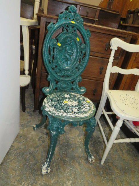 A HEAVY CAST IRON GREEN PAINTED OUTDOOR CHAIR WITH FIGURATIVE DETAIL