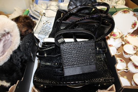 A TRAY OF MOSTLY MODERN LADIES HANDBAGS ETC. TOGETHER WITH A PAIR OF LEATHER COWBOY STYLE BOOTS