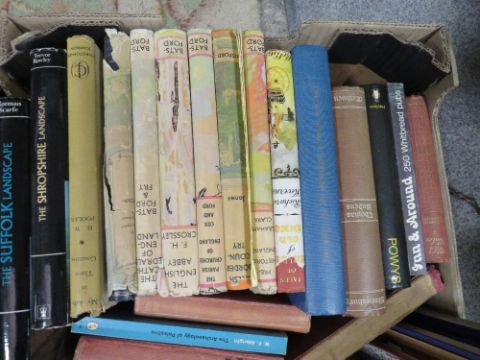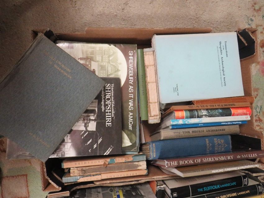 TWO TRAYS OF VINTAGE BOOKS TO INC A SELECTION OF EARLY LOCAL HISTORY BOOKS, HISTORY AND VARIOUS TRANSACTIONS OF THE SHROPSHIRE ARCHAEOLOGICAL SOCIETY