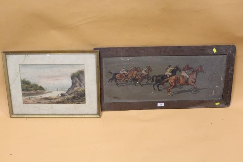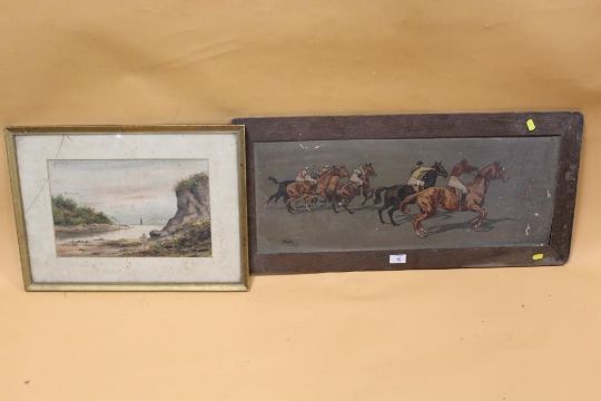 AN ANTIQUE HORSE RACING INTEREST PRINT IN OAK FRAME, TOGETHER WITH A WATERCOLOUR SIGNED J B ANDERSON (2)