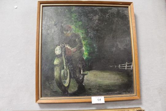A FRAMED OIL ON BOARD OF A MOTORCYCLIST INDISTINCTLY SIGNED LOWER RIGHT