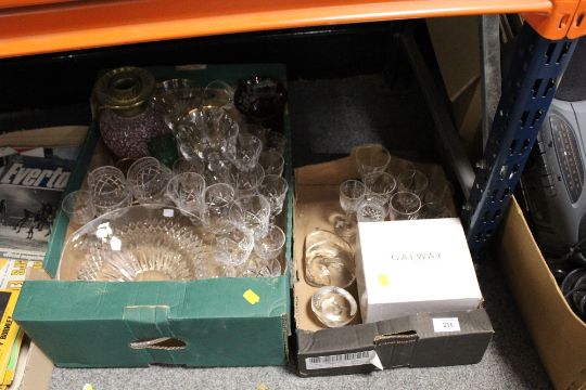 TWO BOXES OF CUT GLASS TO INCLUDE A WATERFORD CRYSTAL FRUIT BOWL WITH SIGNATURE TO BASE, OIL LAMP ETC.
