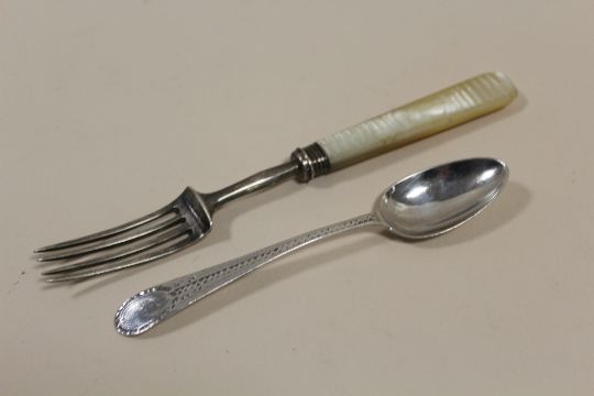 A HESTER BATEMAN BRIGHT CUT TEASPOON TOGETHER WITH A GEORGIAN SILVER AND MOTHER OF PEARL FORK