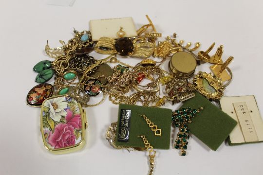 A BOX OF YELLOW METAL COSTUME JEWELLERY ETC.