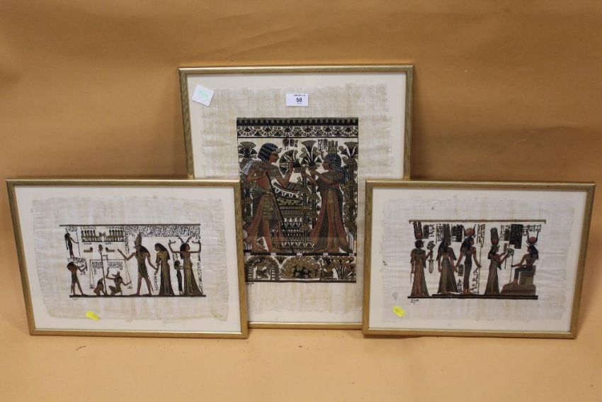 THREE FRAMED AND GLAZED EGYPTIAN PAINTINGS