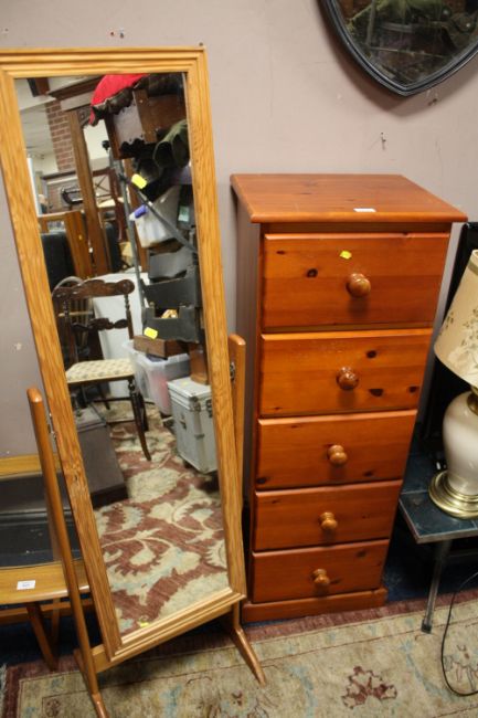 A HONEY PINE TALL FIVE DRAWER CHEST WITH A CHEVAL MIRROR
