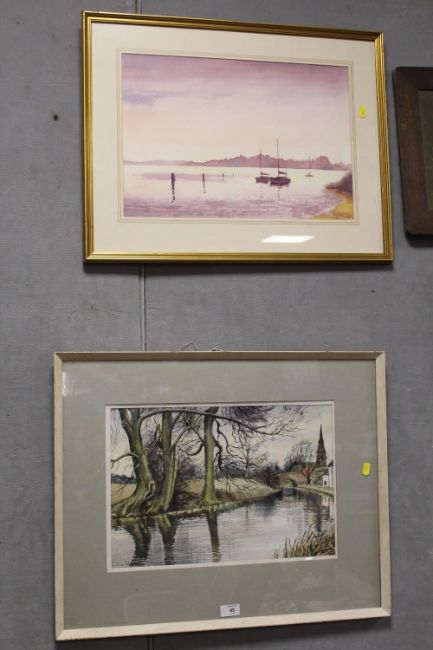TWO FRAMED AND GLAZED WATERCOLOURS DEPICTING SHIPS AT SEA AND A RIVER SCENE